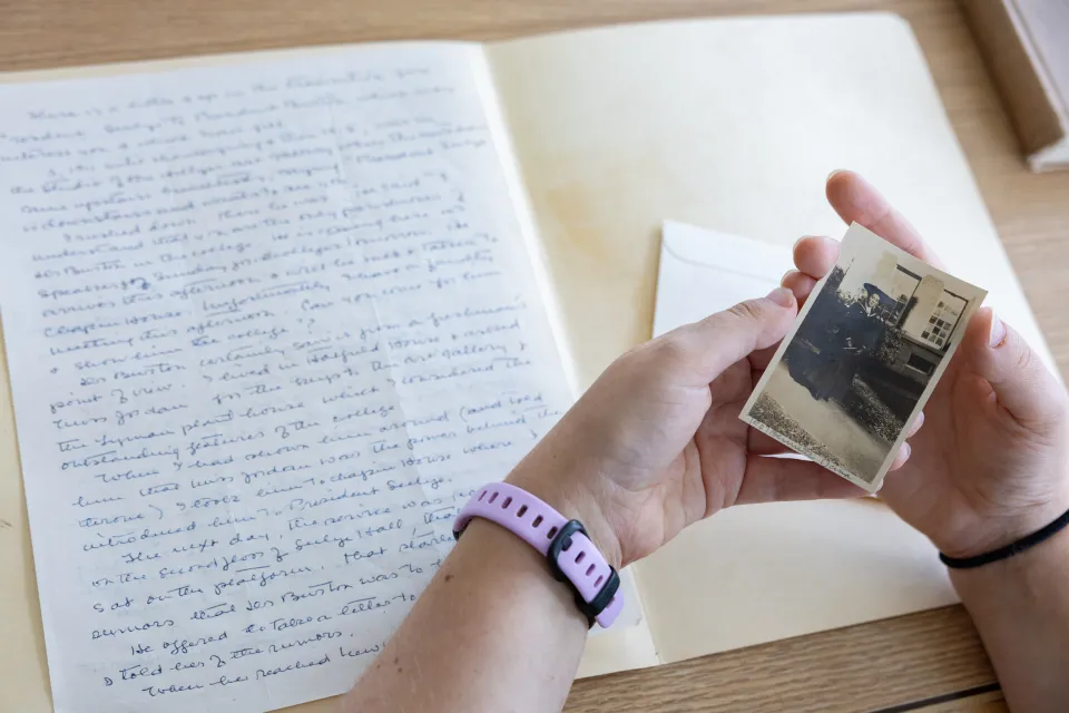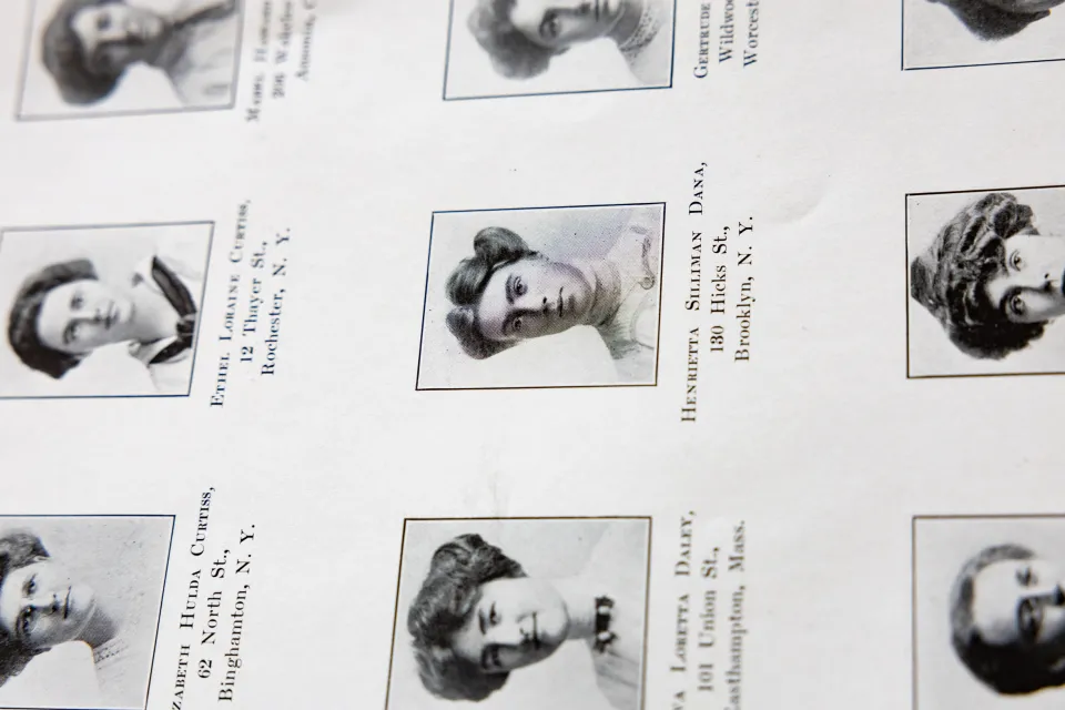 Wilson slips a folder out and opens it carefully to reveal two photos and a handwritten letter. She turns the photos over with care. One, taken in 1909, features a young first-year Smith student wearing a wide black hat and smiling slightly. It’s Wilson’s great-grandmother, Henrietta Silliman Dana Hewitt.