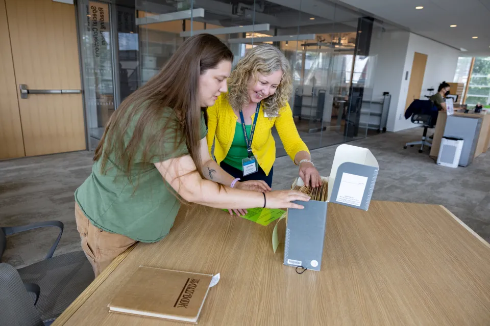 Wilson’s recent visit begins when Head of Special Collections Public Services Leslie Fields brings out a slim gray box of folders and demonstrates how to carefully remove a file and mark the space where it belongs.