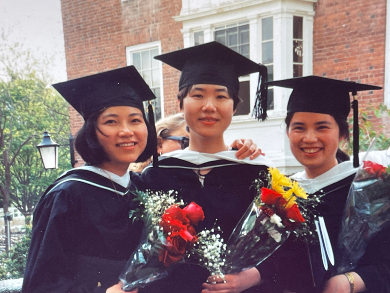 Nancy Xu ’96, Susan Li M.A. ’96 and Chun Lei Pfahnl M.A. ’96 at Commencement 1996.