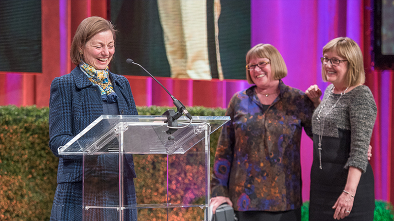 Elizabeth Mugar Eveillard ’69 (left) with Chair of the Board of Trustees Deborah Duncan ’77 and President Kathleen McCartney.