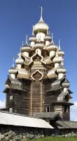 Photos: Top left, a wooden church in Russian orthodox tradition; right, Professor Shevzov’s trip with Smith alumnae in summer 2019—The Waterways of Russia