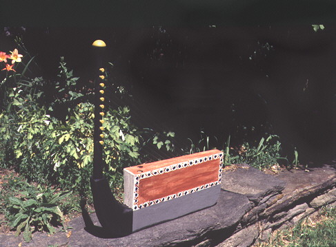 This is a recreation of Queen Shub-Ad's harp, an artifact unearthed early this century from the Sumerian Royal Cemetery at Ur. It is the oldest known example of the true triangular harp, which evolved directly from the hunting bow.