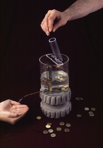 Designed by the Greek inventor Heron, this coin-operated holy water dispenser was used in Egyptian temples to dispense water for ritual washings. Worshippers would place a coin into the machine and receive holy water to bathe themselves with before entering the temple. At the end of the day, the slot machine would be emptied of its coins and refilled with holy water for the next day's worshippers. Dropping a coin into the slot machine initiates a chain reaction: the weight of the coin depresses a metal pan, which in turn results in the opening of a valve, which in turn allows the water to flow out for the worshipper.