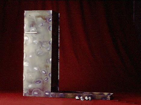 Used in Greek theater to announce the entrances and exits of the gods, the original thunder-making machine was invented by Heron of Alexandria in the first century CE. Pulling the lever opens a trap door which allows numerous brass balls to cascade down a series of shelves and onto a tin sheet. Originally made on a larger scale than the one shown here, Heron's thunder-making machine resonated with deep bass tones when the balls were released.
