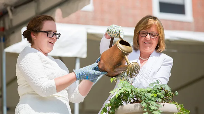 Ivy Day has been a Smith tradition for more than a century. On the day before Commencement, alumnae escort the seniors, dressed in white and carrying roses, in a parade around campus. Then the seniors plant ivy to symbolize the connection between the college and its graduates.