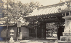The impressive street entrance to the Awata Palace in Tokyo, Japan, one of the show places. Here we see the rather low stone wall, surmounted by a tile coping. The heavy doors are of cryptomeria wood. |