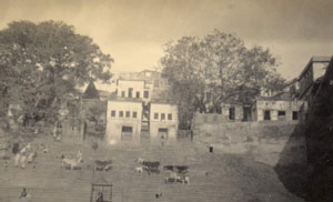 Another river bank scene in front of some temple buildings in Benares, India, where people and the sacred cows wander about together, and the conditions are deplorable. The two great trees are Ficus religiosa, frequently found in or around temple grounds. |
