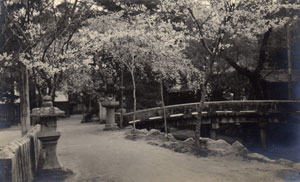 The arched stone bridge that leads across the outlet of ponds to the temple garden, in Miyajima, Japan. This picture was taken in cherry-blossom time and shows some of the flower-laden trees that add so much to the beauty of the place. |