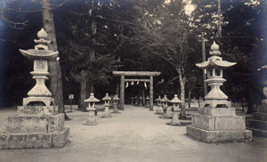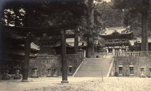 Iyeyasu temple at Nikko. This is the last court of all, and by far the most magnificent. The Torii leading to it is decorated with the Iyeyasu crest, much like a three-leaved clover. Huge old cryptomeria trees give shade. The buildings are very beautifully decorated in color. Japan. |