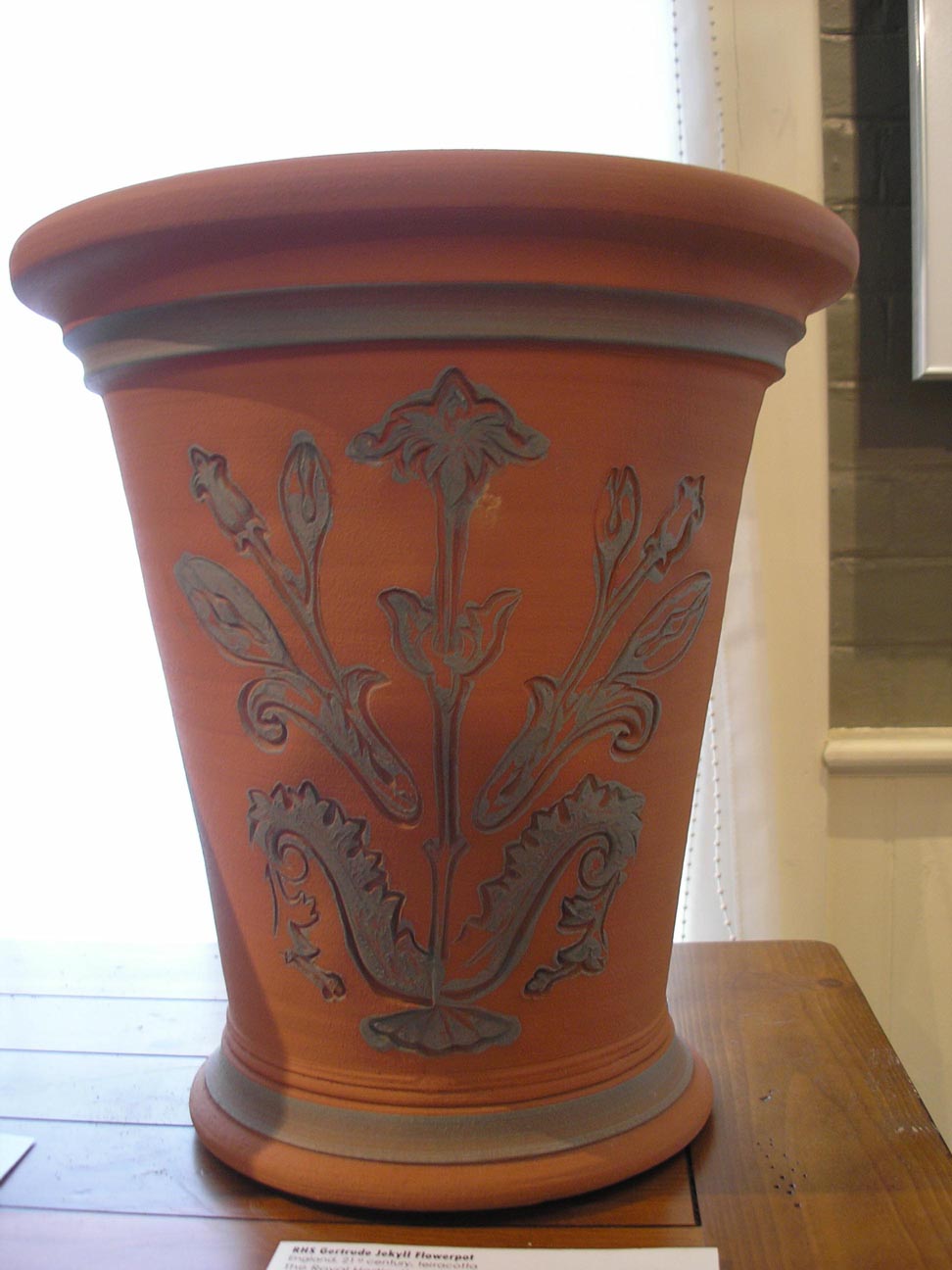The Royal Horticultural Society Jekyll flowerpot is decorated with an incised design. Jim Keeling discovered the pen-and-ink drawing of the pot in a sketchbook of early 20th-century garden designer Gertrude Jekyll.