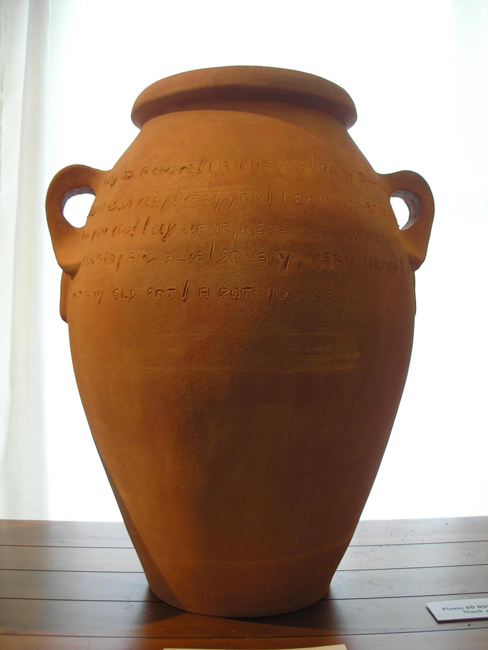 Artist and gardener Robert Dash said, "I wanted The Poetry Pot to look ancient and hoary, as if it had been buried for centuries under the sea, which is why some of the words have been rubbed out."