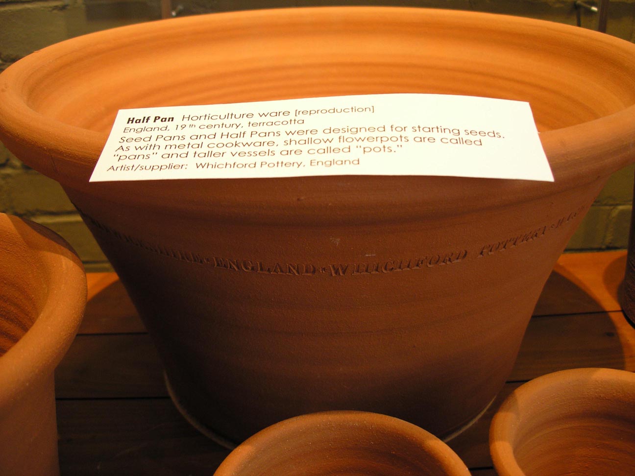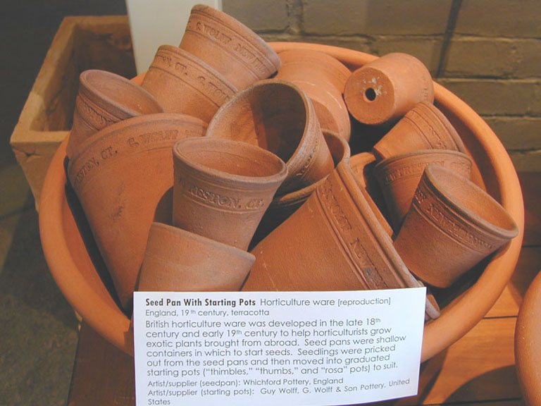 British horticulture ware was developed in the late 18th century and early 19th century to help horticulturists grow exotic plants brought from abroad. Seed pans were shallow containers in which to start seeds. Seedlings were pricked out from the seed pans and then moved into graduated starting pots ("thimbles," "thumbs," and "rosa" pots) to suit.