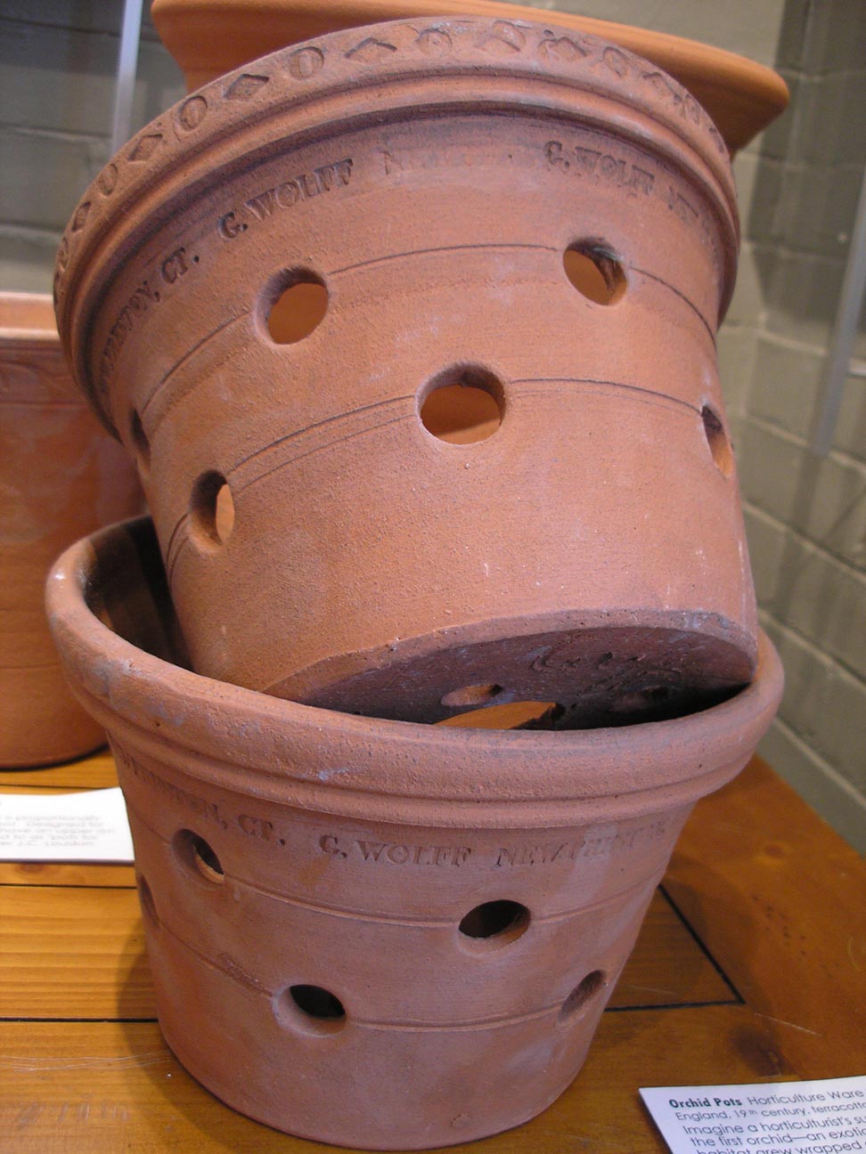 Imagine a horticulturist's surprise when attempting to pot the first orchid; an exotic plant whose roots in its natural habitat grew wrapped around the branch of a tree. The first orchid pots appeared in England in the late 19th century. In fact, the very first pierced pots reputedly were made by plant explorer Joseph Banks.