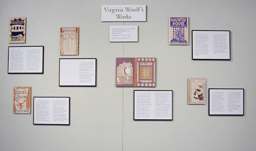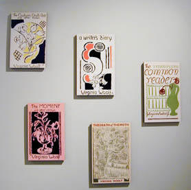 | Virginia Woolf, Kew Gardens Richmond: Hogarth Press, 1919. One of 150 copies, with cover hand-painted by Roger Fry and woodcuts by Vanessa Bell. Frances Hooper Collection of Virginia Woolf, Mortimer Rare Book Room, Smith College (center in case) |