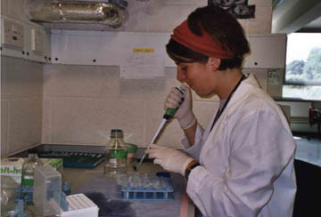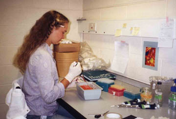 Ilana Moir, '03 and Leslie Weaver, '04 in the Jodell Laboratory, 2002. |