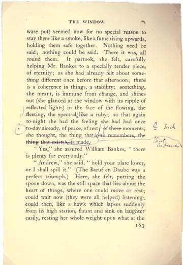 To The Lighthouse: Virginia WoolfWoolfs fifth novel was published on the thirty-second anniversary of her mothers death. It is based upon Woolfs memories of summers spent in St. Ives, Cornwall, at Talland House with her family. Like Vanessa in Woolfs memoir 22 Hyde Park Gate, the painter, Lily Briscoe, in To the Lighthouse is nice to her boorish dinner companion, Charles Tansley, because she knows it is expected, but secretly she thinks about her unfinished oil painting. Mrs. Ramsays moment of epiphany at the dinner table is edited by Woolf to read: Of such moments, she thought, the thing is made that endures. Virginia Woolf. To The Lighthouse: corrected page proofs.