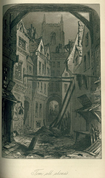 H.K. Browne's best illustrations for Dickens' novels are said to occur in Dombey and Son, David Copperfield, and Bleak House Dickens' ninth novel. For Bleak House, Browne developed a new technique, referred to as "dark plates," which aptly renders the somber mood of the work. The novel describes England as a "bleak house," devastated by an irresponsible, self-serving legal system and a patriarchal society. The dark plate technique involved using a ruling-machine (operated by an assistant) which cut a close-spaced criss-cross pattern of lines into the plate, thus creating an overall dark cast on the resulting print. The illustrations shown here reveal the marked contrast between regular etching on steel and the dark plate method ("Tom all alone's").