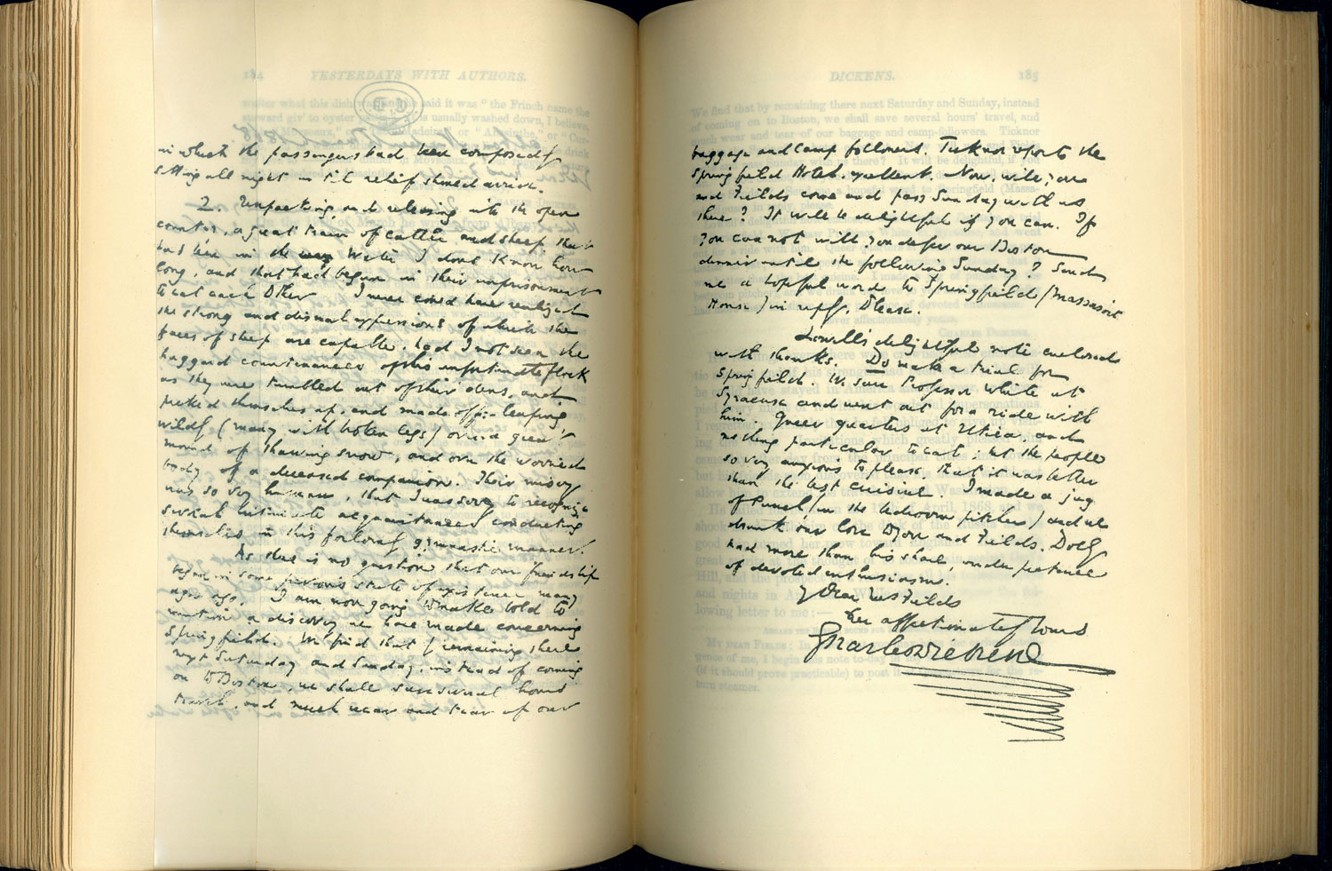 Fields first met Charles Dickens in Boston during Dickens' first American tour in 1842, and they remained friends. First published in 1871, Fields' Yesterdays with Authors, includes his reminiscences of Thackeray, Hawthorne, Wordsworth, Dickens, and a few others. He includes portraits and letters, such as a facsimile of Dickens' letter to Mrs. Fields, written in March 1868, while he was on his last American tour. Dickens discusses when they might meet in Boston, asking her: "Send me a hopeful word to Springfield (Massasoit House) in reply, please." Dickens came to Springfield, Mass., during both his 1842 and 1868 American tours. Annie Fields, the publisher's second wife, was at the center of Boston's literary and philanthropic life, both during and after her husband's death in 1881.
