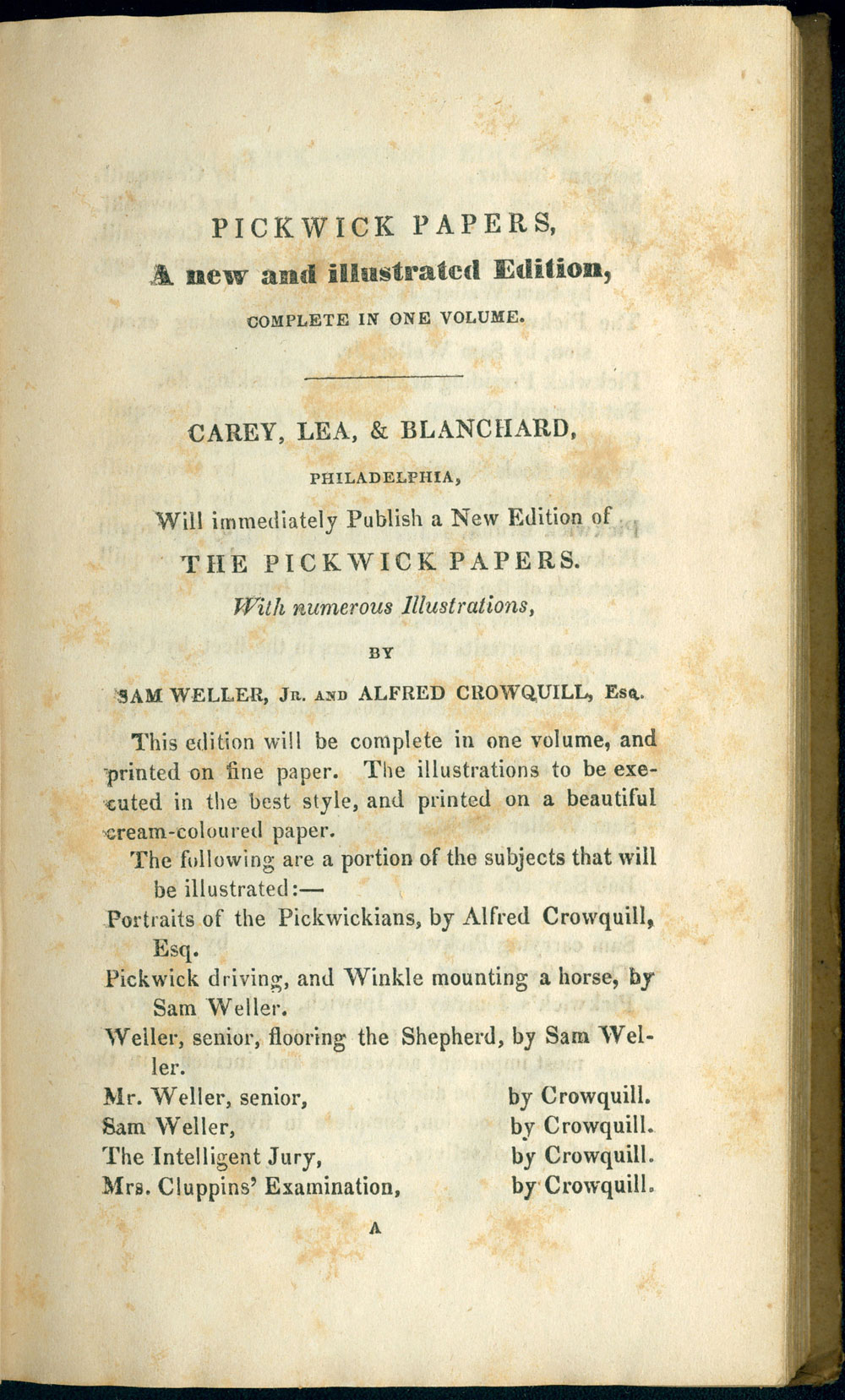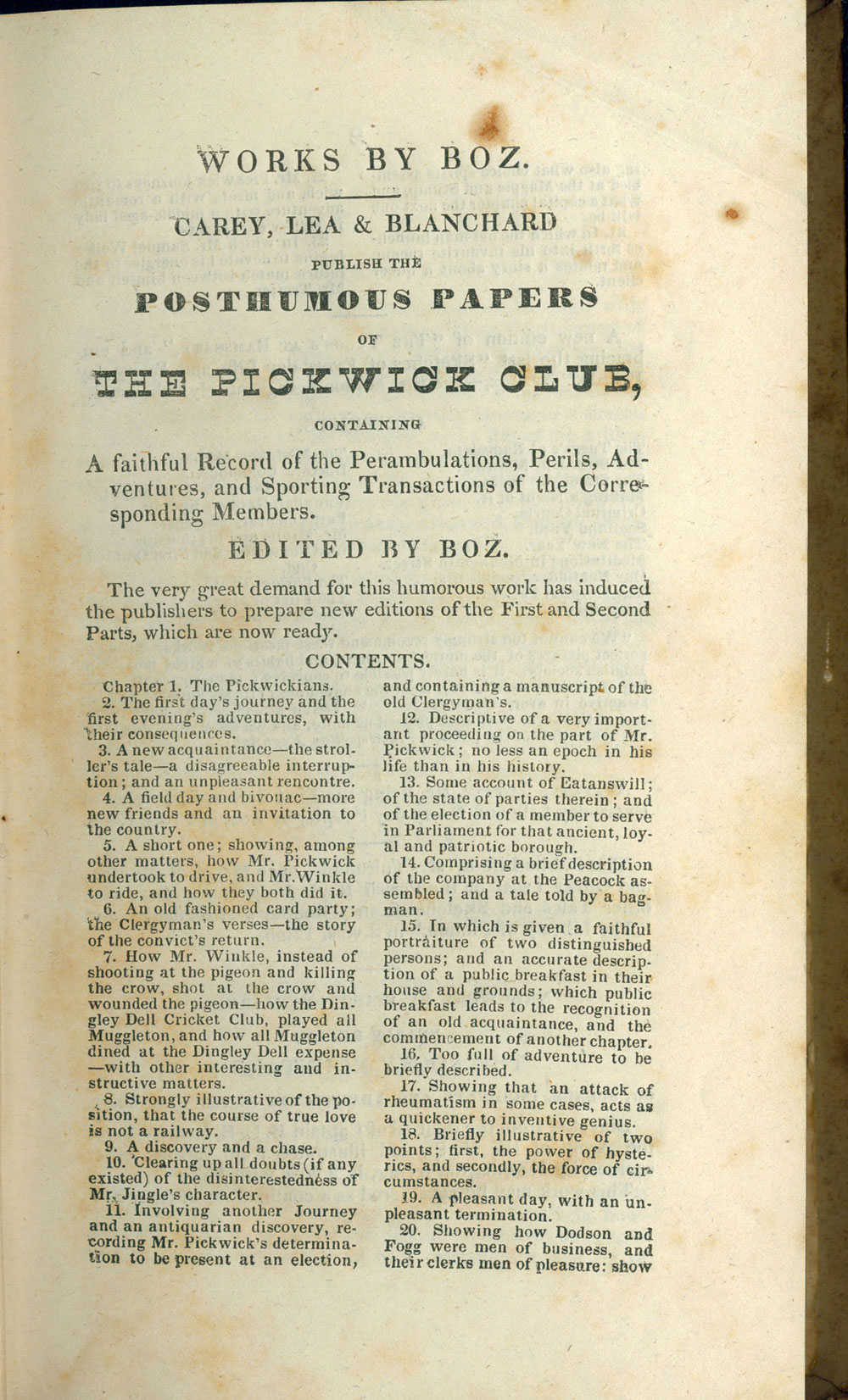 | As Dickens' reputation skyrocketed with the publication of Sketches by Boz, American publishers were eager to publish his works themselves. This first American edition of The Pickwick Papers was published and bound in five volumes in cloth and paper (with a spine label reading The Pickwick Club) by Carey, Lea & Blanchard of Philadelphia. In volume one, the publisher included reviews of the work from various sources, printed on several pages before the title page. Other titles published by the Philadelphia firm are advertised in volume four. The Pickwick Papers was immensely popular, as evidenced by the advertisement at the beginning of volume three, which includes: "The very great demand for this humorous work has induced the publishers to prepare new editions of the First and Second Parts, which are now ready." This first American edition was not illustrated, but in the last volume, the publisher inserted an advertisement for "A new and illustration Edition, complete in one volume," which they "will immediately publish."