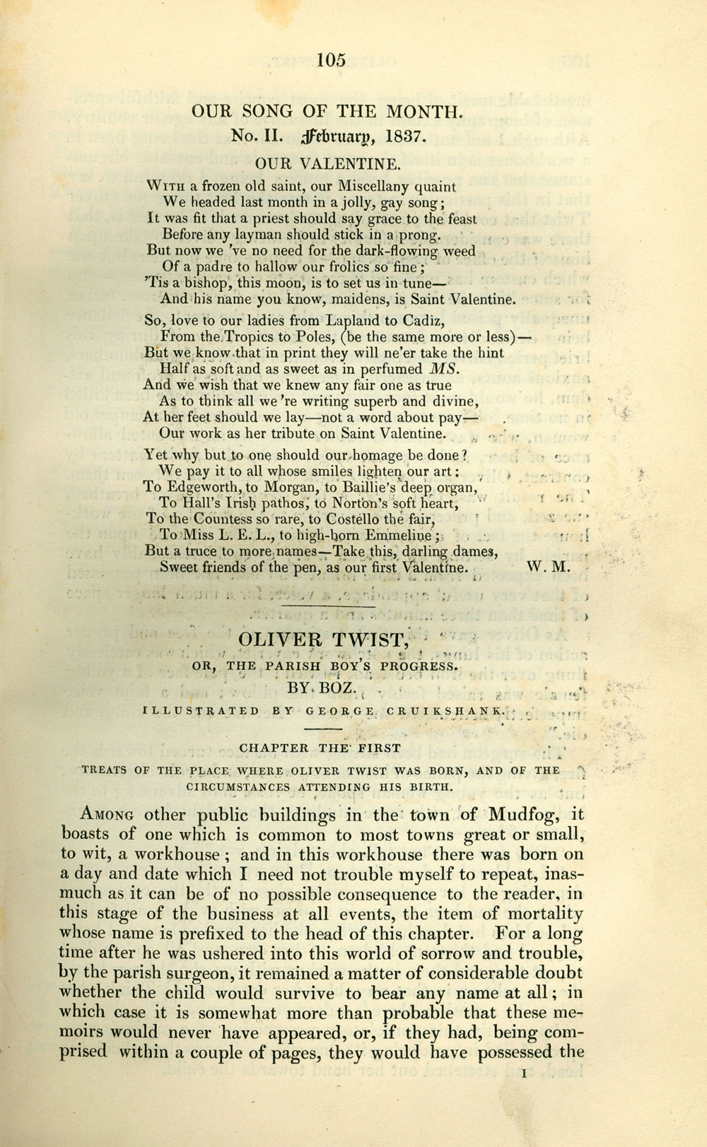 Bentley's Miscellany was a general interest magazine, issued monthly from January 1837 until 1868. Charles Dickens was its first editor, and in the "Prologue" at the start of volume 1, he outlines the goals for the new journal: