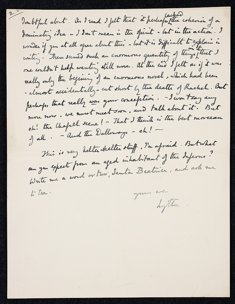 Lytton Strachey for her first novel, The Voyage Out: “At the end