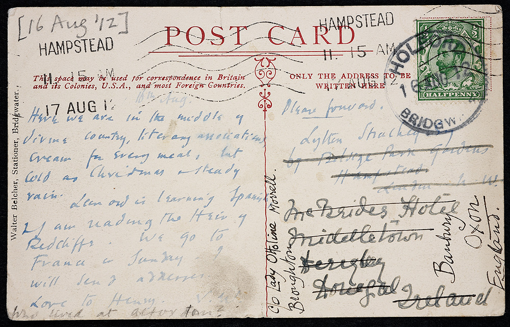 Virginia Woolf. Pictorial postcard to Lytton Strachey, 16 August 1912.