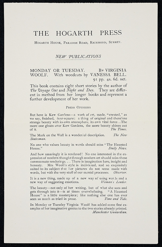 Hogarth Press. Advertisement for Monday or Tuesday, 1921.
