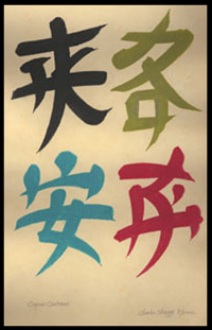 Fanciful CalligraphyShown here are two recent examples of Charles Skaggs’ lettering and use of stencils. “Latin Lark” is signed and dated April 2002; “Caprice Cantonese,” with invented Chinese characters, was completed in May of this year. |