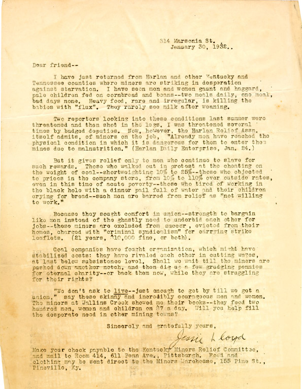 Jessie Lloyd O'Connor to "Friend," Fund-raising Letter