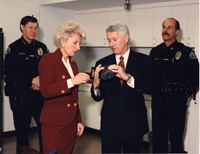 Jane Harman and the Redondo Beach Police Department examining the Night Enforcer 250 developed by ITT Filfillan, 17 February 1995.