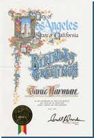 Birthday greetings certificate from the City of Los Angeles, 1 July 1995.