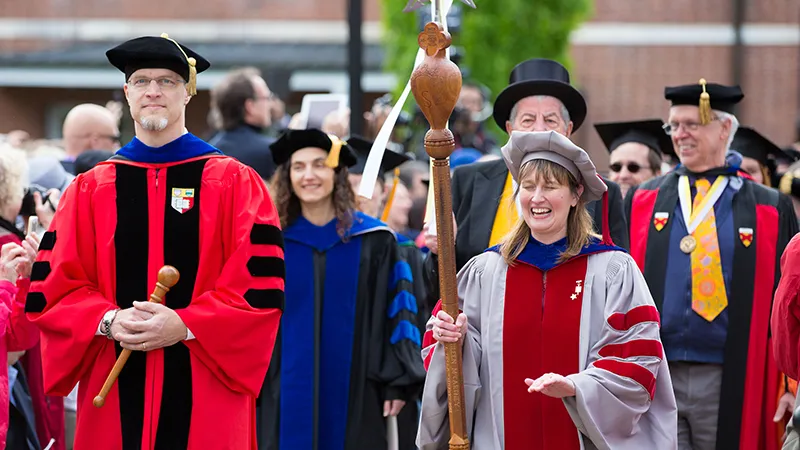 Colors designate the wearer’s college or university and field of study. The color of the sleeve bars and of the velvet on the hood indicates the academic field, distinguished as follows: white for arts and letters, light blue for education, brown for fine arts, pink for music, dark blue for philosophy and yellow for science. The degree-granting institution is traditionally represented by the color of the hood’s satin lining. Robe color and cap shape may also designate the college or university. Some Smith faculty members wear the Charis medal, which is awarded to those who have served on the faculty for 25 years or more.
