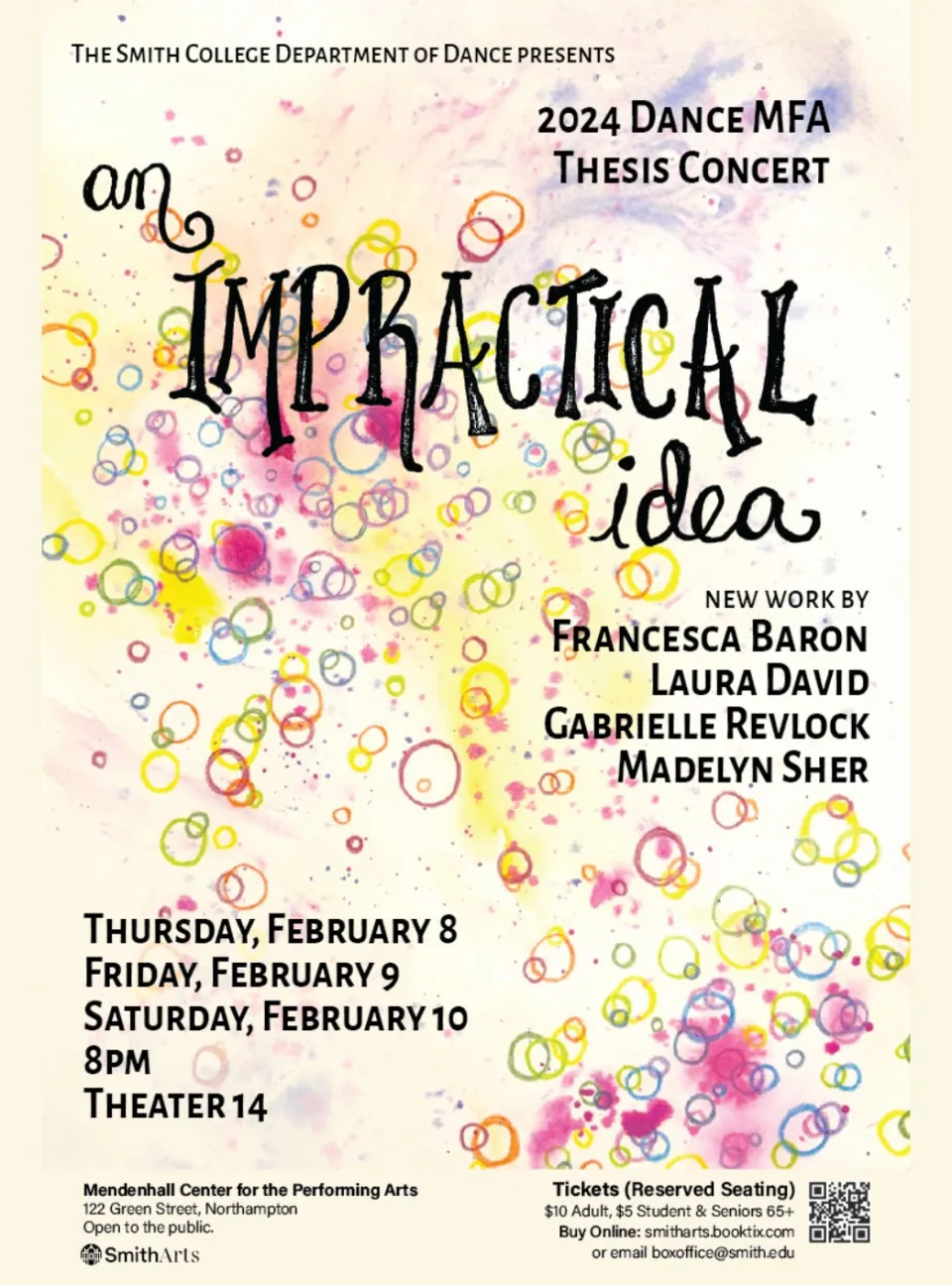 NORTHAMPTON, MA — The Smith College Department of Dance presents the 2024 Dance M.F.A. Thesis Concert: an Impractical Idea featuring choreography by 2nd year M.F.A. candidates Francesca Baron, Laura David, Gabrielle Revlock, and Madelyn Sher. Performances will take place on February 8, 9, and 10 at 8 p.m. in Theatre 14 in Smith’s Mendenhall Center for the Performing Arts. Tickets available online at smitharts.booktix.com.