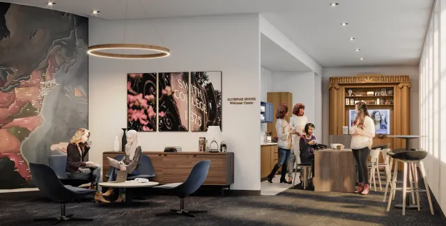 This rendering shows the new first-floor Welcome Center, which will provide a home away from home for alums and an inviting gathering and study space for students.