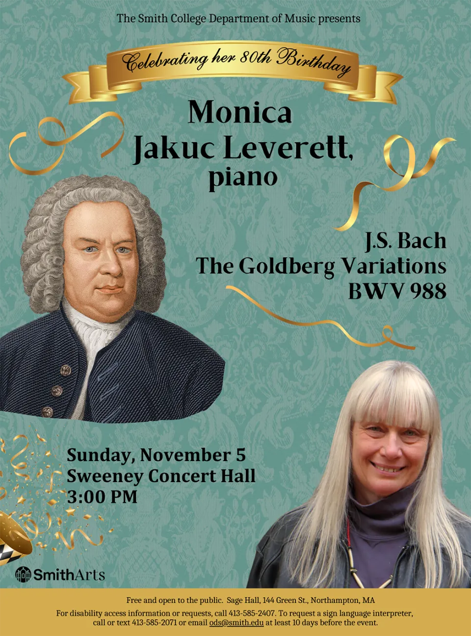 Northampton, MA – The Smith College Department of Music presents a special concert of Bach’s Goldberg Variations by pianist Monica Jakuc Leverett in celebration of her 80th birthday on Sunday, November 5 at 3 p.m. in Sweeney Concert Hall. Jakuc Leverett has been playing the Goldberg Variations for the last 60 years and considers Bach’s masterwork her signature piece. The performance is free and open to the public.