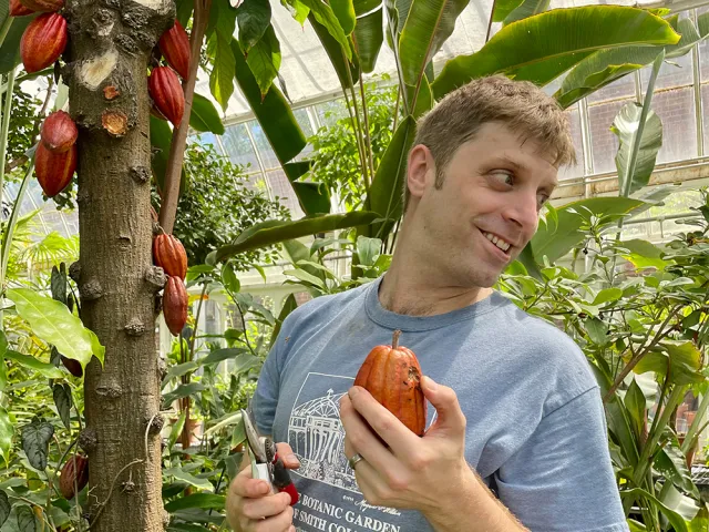 Horticulturist Dan Babineau harvests pods from the cacao tree in Lyman Conservatory.