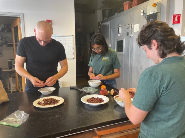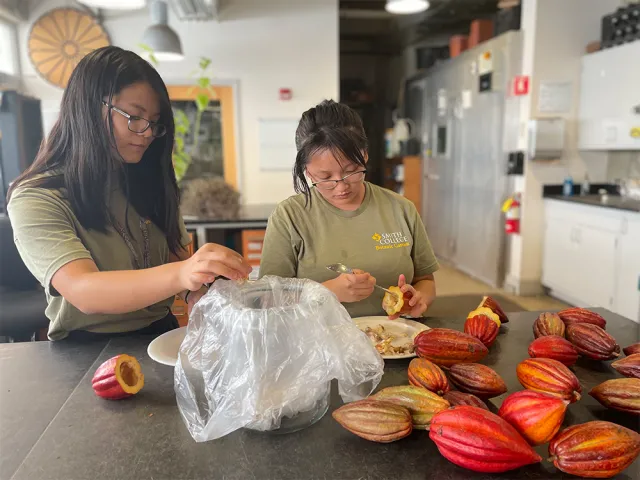 The treat was part of the answer to a question Smith College Botanic Garden staff and interns had been asking for over a year, ever since fruit began to ripen on a tree in the Lyman collection: Could Smithies take cacao pods and make their own sweets?