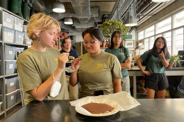 The small group of student interns filed into the potting room, a cool space on a warm Lyman Conservatory day, and arranged themselves around a white platter. A large slab of chocolate was waiting on a plate, glossy and inviting.