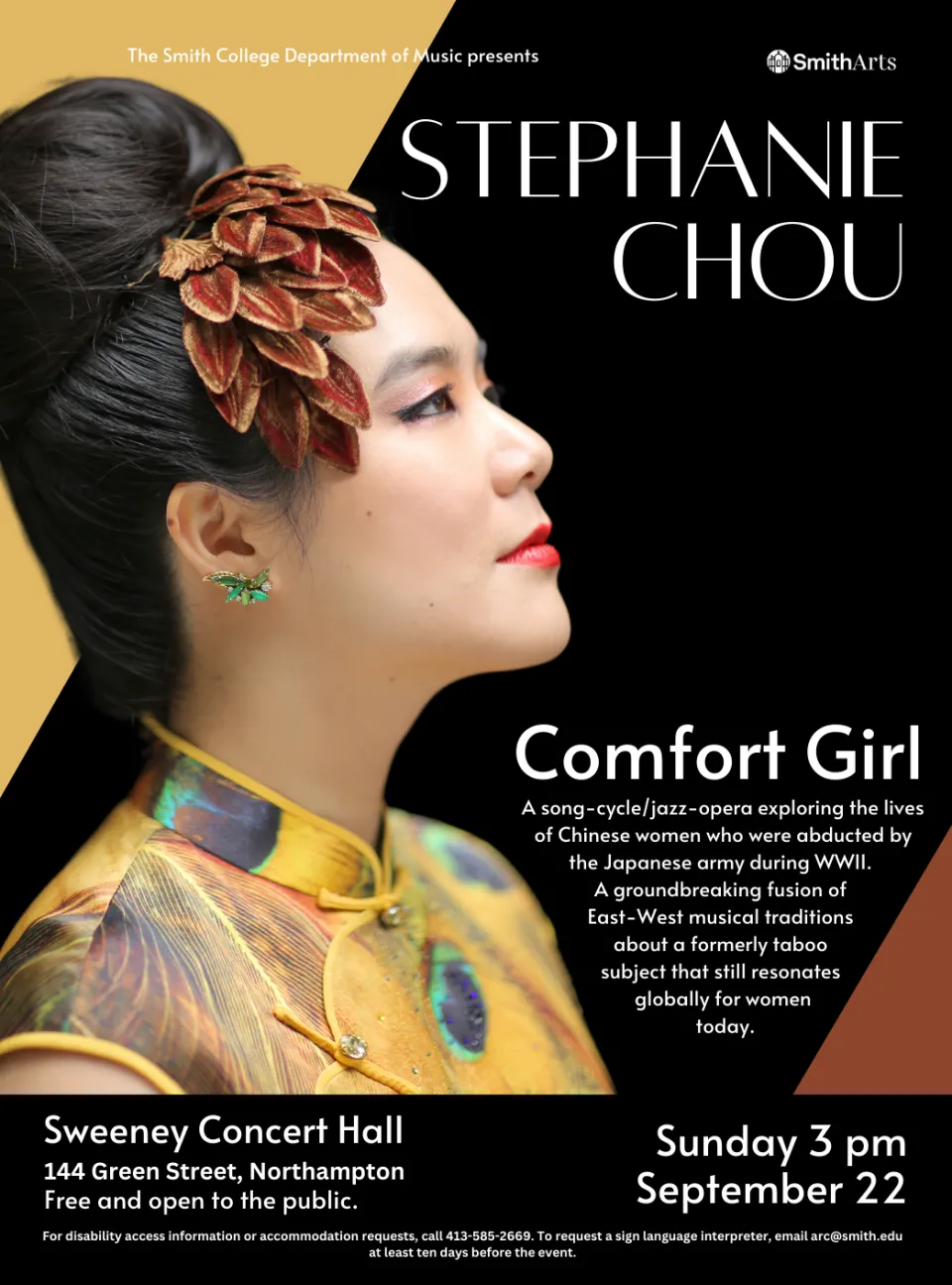 NORTHAMPTON, MA – The Smith College Department of Music presents Stephanie Chou performing her work Comfort Girl, an 80-minute song-cycle exploring the lives of thousands of Chinese women who were abducted by the Japanese army during WWII on Sunday, September 22 at 3 p.m. in Sweeney Concert Hall. The groundbreaking jazz-opera fuses East and West musical traditions to explore a formerly taboo subject that still resonates globally for women today. The concert features the Stephanie Chou Band and is free and open to the public. Commissioned by the American Composers Forum, Comfort Girl highlights an often-overlooked, dark chapter in history that is still relevant, as survivors seek justice and trafficking remains a global issue. This jazz-influenced song-cycle combines historical drama with the energy of improvised jazz featuring two voices, narrator, Chinese erhu, strings, saxophone, and rhythm section. New York Music Daily called Comfort Girl “A mighty, harrowing new Suite….a phantasmagorical song cycle.”