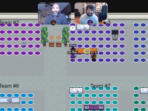 Smith professors Michael Barresi (left) and Daniel Vahaba launch a virtual student project session designed like a video game.