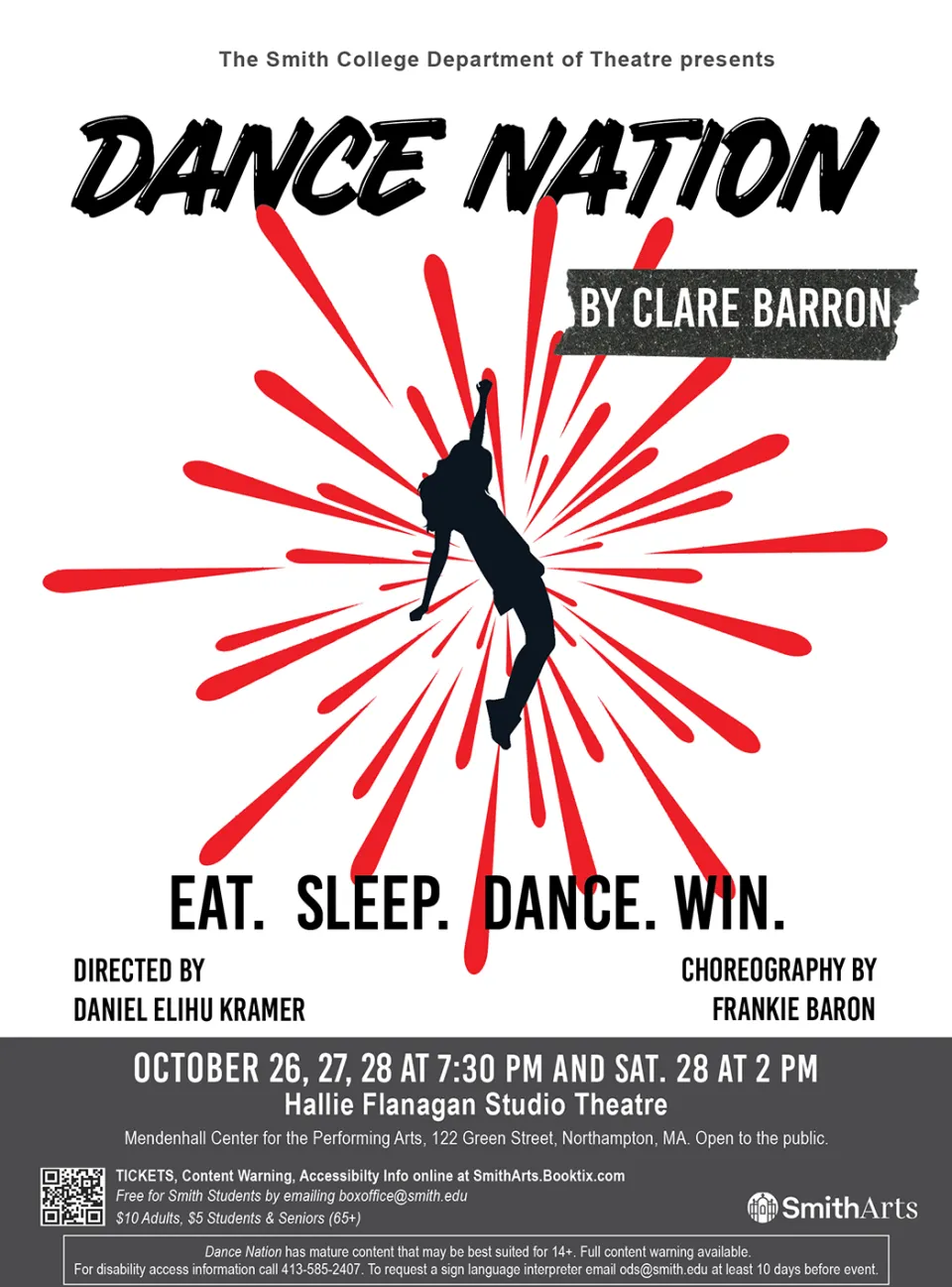 NORTHAMPTON, MA – The Smith College Department of Theatre presents Dance Nation by Clare Barron in Hallie Flanagan Studio Theatre on October 26, 27, 28 at 7:30 pm with a 2 PM show on October 28 directed by Daniel Elihu Kramer. The play depicts a team of young competitive dancers as they plot to take over the world. If their new routine is good enough, they’ll claw their way to the top at Nationals in Tampa Bay. Dance Nation is a play about ambition, growing up, and trying to survive adolescence with your dreams intact. Grounded in emotional truths, the play pushes past realism to depict the dancer’s inner lives. New York Magazine declared it “a brave, visceral, excitingly off-kilter barbaric yawp of a play. It’s angry and it’s sad. It’s brash and it’s funny. And it gets at something excruciatingly tender: the burden of modesty on young American women.”