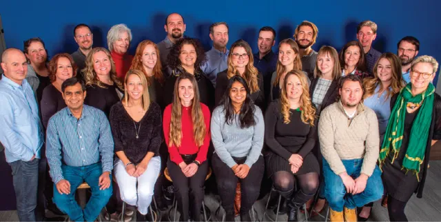 Annie De Groot ’78, far right, and her team of vaccinologists at EpiVax, including Christine Swymer Boyle ’90 and Frances Terry ’06, middle row, third and fourth from right.