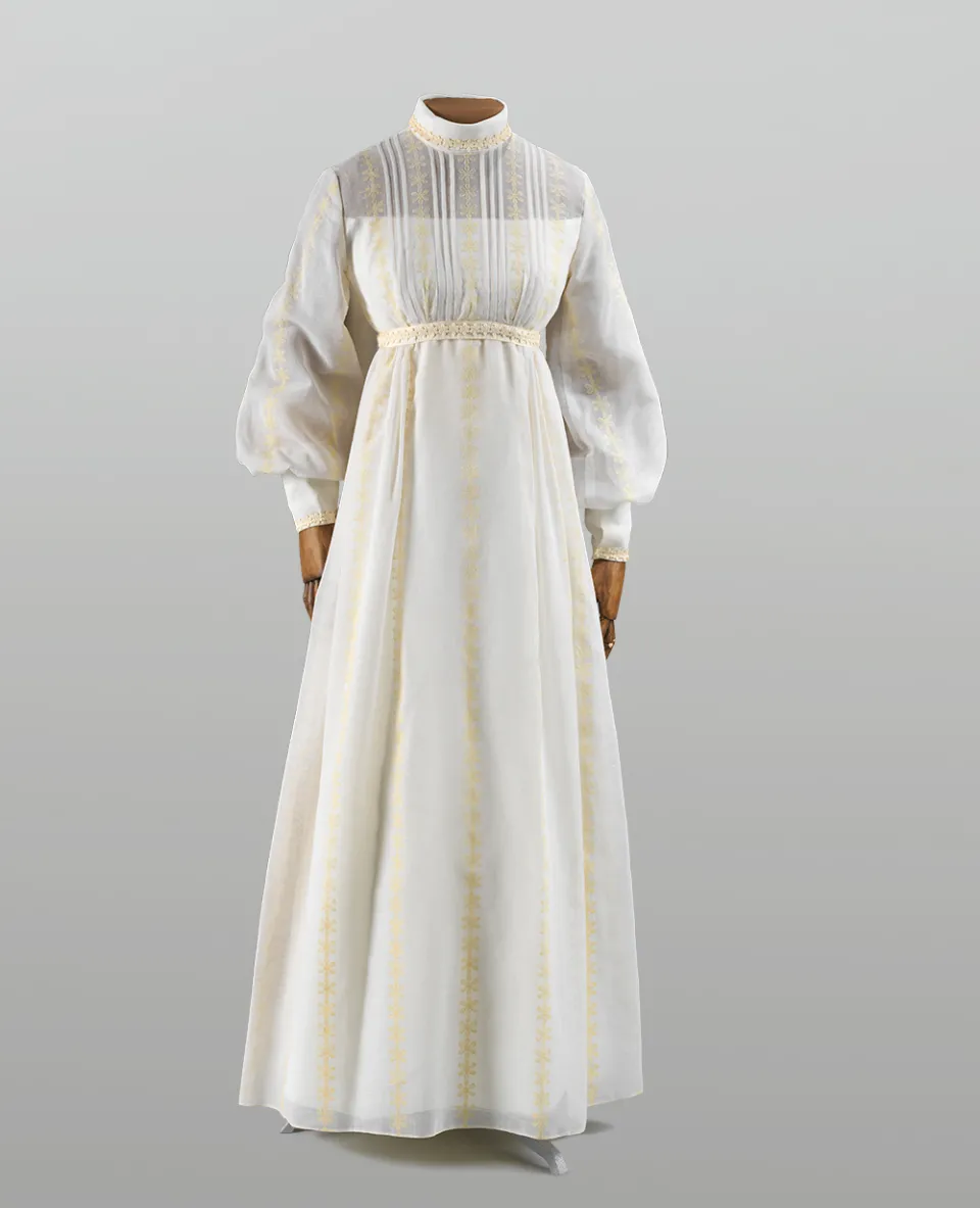This 1970s wedding dress, worn by Barbara Borenstein Blumenthal ’75, challenged traditional norms with its romantic, folkloric appearance and balloon sleeves to enhance movement—all popular trends in counterculture fashion.