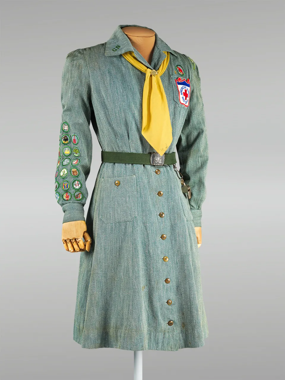 The vibrant green of this 1940s Girl Scout uniform worn by Sylvia Plath ’55 was made the official color of the Girl Scouts in the 1930s. The buttons are made of vegetable ivory, a natural, renewable material derived from the nut of the tagua palm tree.