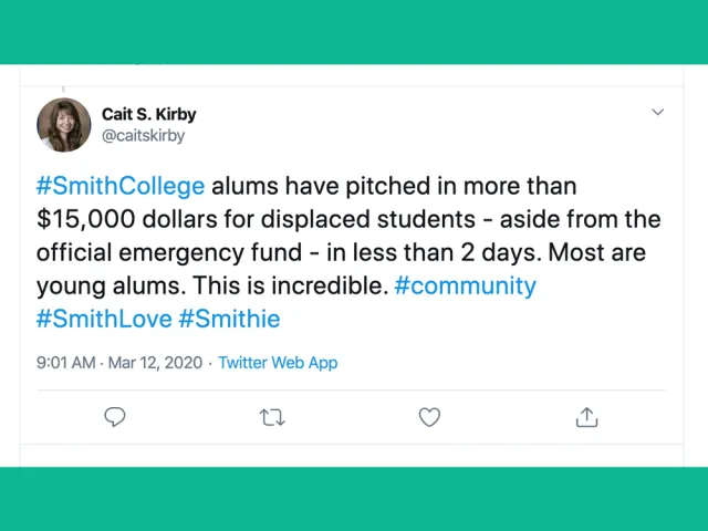 Immediately after it was announced that students would have to leave campus, for example, alumnae began contributing to a Student Emergency Aid Fund, So far, more than 500 alumnae have donated in excess of $66,000 to support Smith students’ financial needs as they continue their spring semester studies away from campus.