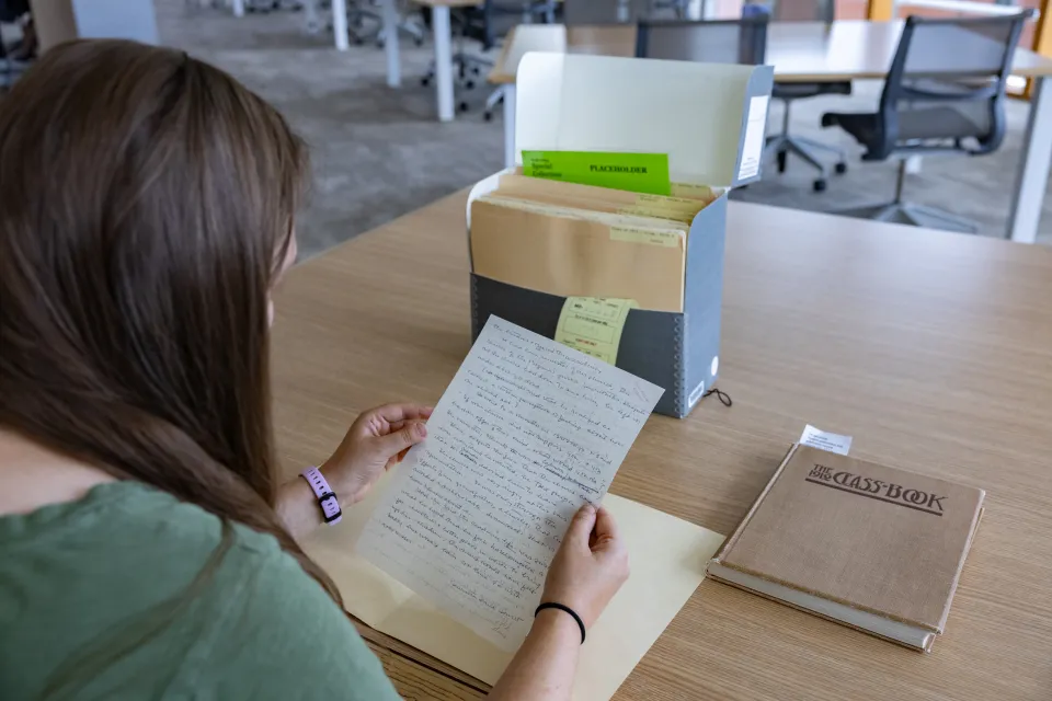 Wilson’s recent visit begins when Head of Special Collections Public Services Leslie Fields brings out a slim gray box of folders and demonstrates how to carefully remove a file and mark the space where it belongs.