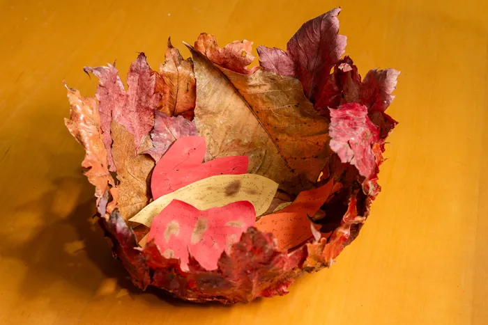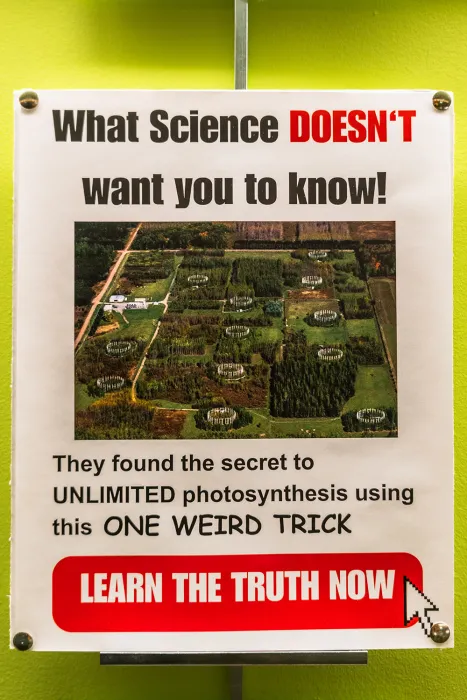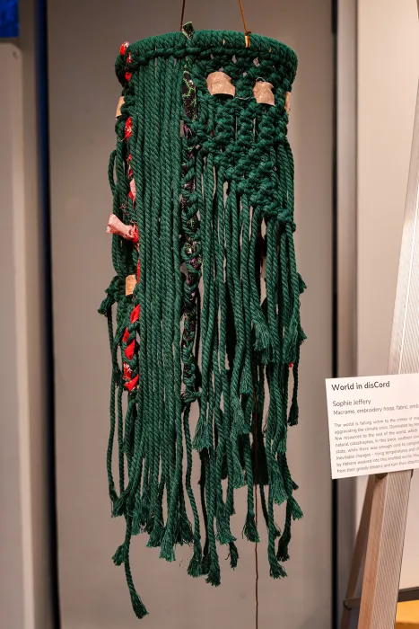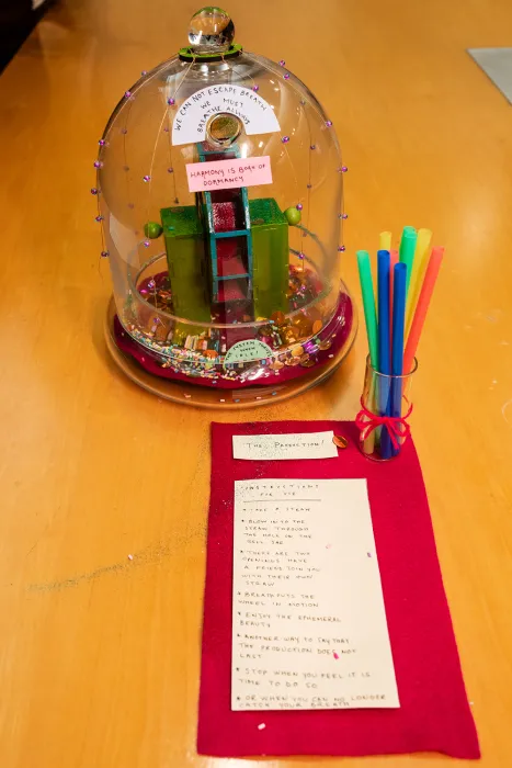 In December 2023, an exhibit of the class’s art projects allowed others on campus to see Gersony’s students’ creations, which included poetry, paintings, collages, sound recordings, fiber arts, and handmade books. For the show, students provided labeled descriptions of their work. An interactive sculpture by Chlo Gold ’25, titled The Production!, illustrated the process of carbon dioxide (CO2) fertilization. Using a bell jar, straws, sequins, and beads, participants were encouraged to blow through a straw and observe as the wheel inside the bell jar started moving, with breath as the catalyst. “As we learned in class, CO2 fertilization, which increases CO2 in the atmosphere, is purported by climate change deniers to benefit plants,” says Gold. “However, the positive effect is short lived and eventually these heightened CO2 rates deplete the system and prove detrimental to plants. Rather than demanding productivity and output from plants, my piece poses an alternate reality where we embrace slowness and smallness from our botanical kin, and for ourselves.”