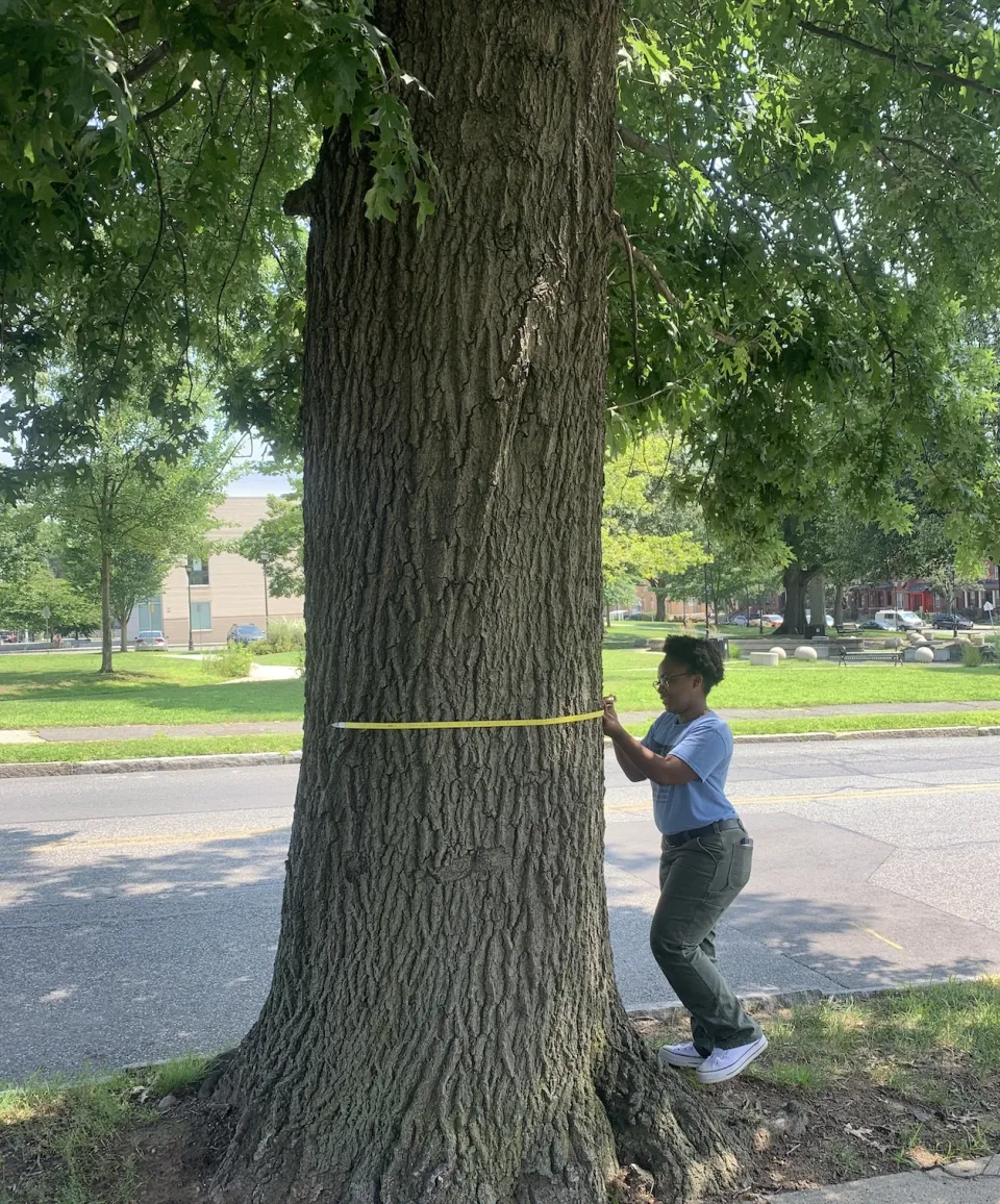 MJ Kabongo ’23 measures the diameter of an older tree in downtown Holyoke, last summer, as part of the Smith College/Holyoke Community College Urban Tree Project research study.