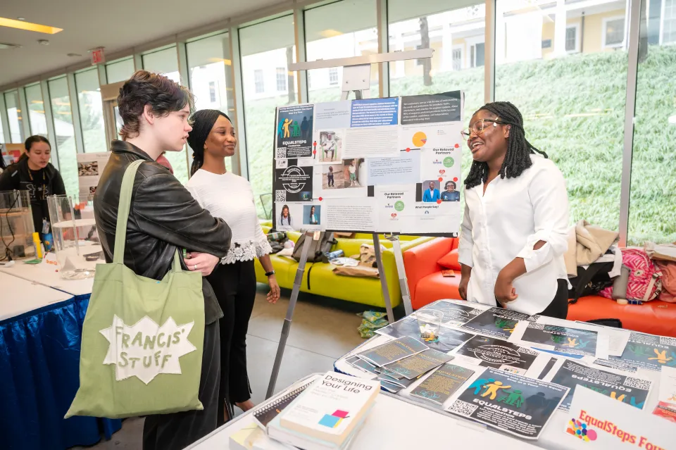 Event goers talk to Juliana Kudzai Makonise ’25 and Joanne Lee ’27 about Friends Beyond Borders, which proposes college application assistance to refugees.