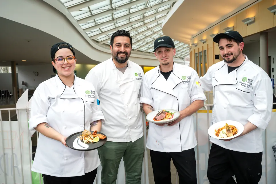The Culinary Innovators Challenge featuring Smith dining. From left to right: Anaila Aleman, floater utility assistant; German Alvarado, director of culinary services; Julian Martineau, cook’s assistant; and David Dejordy, Campus Center Cafe retail chef.